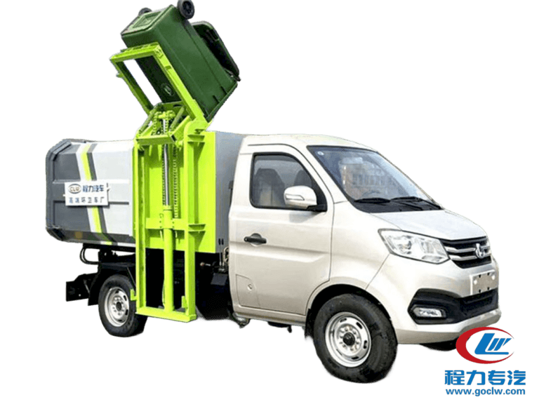 Equipped with a hydraulic lifting mechanism to automatically dump standard trash bins into the truck body, perfect for urban residential collection.